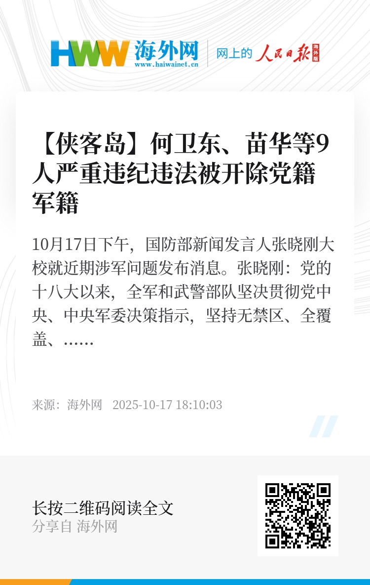 對(duì)何衛(wèi)東、苗華、何宏軍等人的嚴(yán)肅查處,再次表明了黨中央、中央軍委將反腐敗斗爭進(jìn)行到底的堅(jiān)定決心,彰顯了軍中絕不允許有腐敗分子藏身之地的鮮明態(tài)度,是黨和軍隊(duì)反腐敗斗爭取得的重大成果,人民軍隊(duì)更加純潔鞏固、更具強(qiáng)大凝聚力戰(zhàn)斗力。